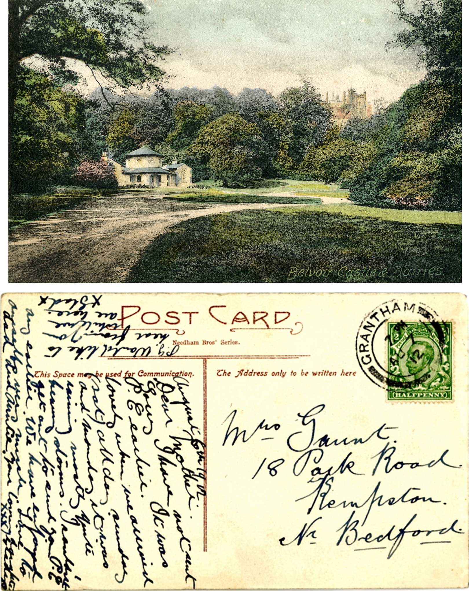 This postcard was sent by Gladys Earl (nee Williams #25) to her mother-in-law Mary Gaunt (nee Divers #29) on 12th August 1912. Mary Earl (nee Divers) married Henry Gaunt (#437) in June 1909 following the death of her first husband William Henry Earl (#28) on 21 September 1901. Gladys was probably visiting her husband's uncle William Henry Divers who at that time was the head gardener at Belvoir Castle.
