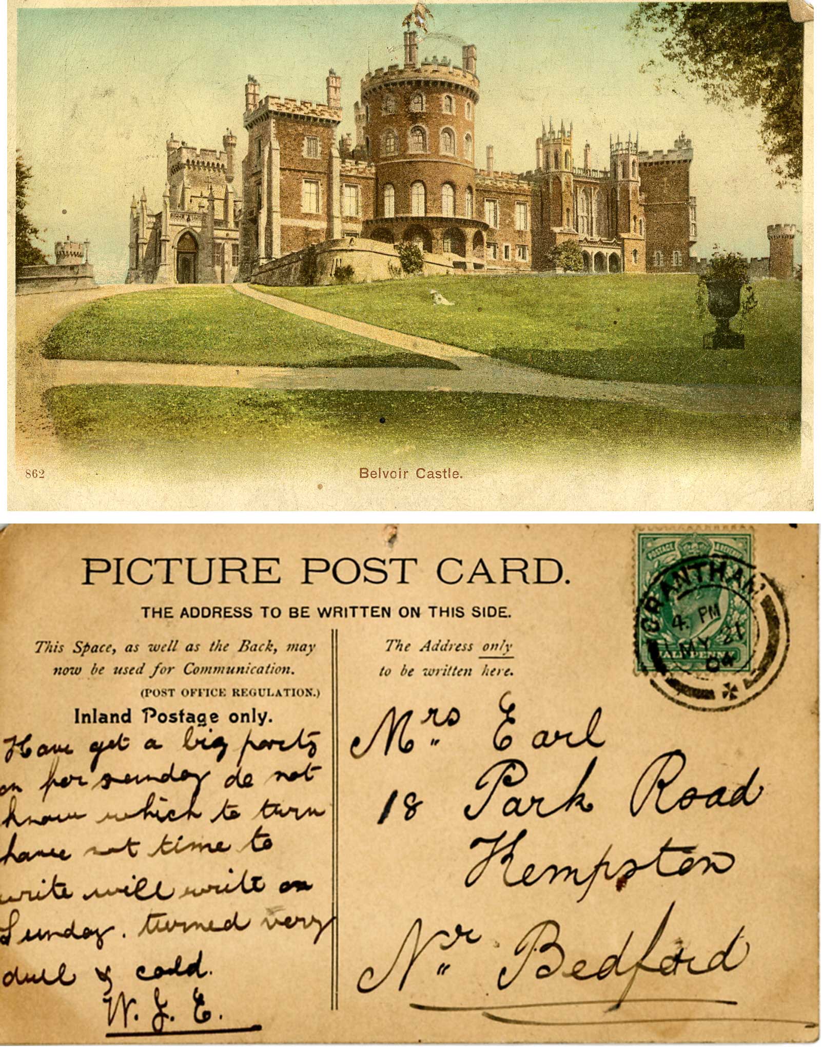 This postcard was sent by William Joseph Earl (#E1) to his mother Mary Earl (nee Divers #29) on 21st May 1904. From the wording on the postcard it reads as if William is working at Belvoir Castle or visiting his uncle William Henry Divers who at that time was the head gardener at Belvoir Castle. William later went on to be a gardener at The Gardens, Welbeck, Worksop, Nottinghamshire (1911 Census) and in 1929 was a gardener at The Gardens, Knowsley, Prescot, Lancashire.