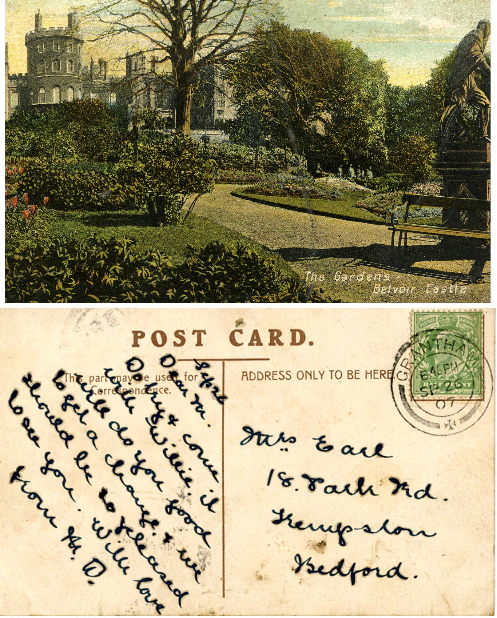 This postcard was sent to Mary Earl (nee Divers #29) on 26th September 1907 when William Henry Divers (#D1) was head gardener at Belvoir Castle.